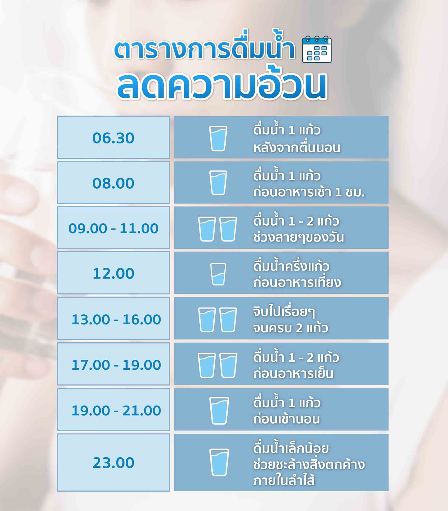 สำหรับใครที่ต้องการดื่มน้ำลดความอ้วน สามารถทำตามตารางการดื่มน้ำลดความอ้วนได้ แต่ก็ต้องอาศัยการมีวินัย และความต่อเนื่องในการปฏิบัติ เพื่อให้ได้ผลลัพธ์ตามที่คาดหวัง ดังนี้
