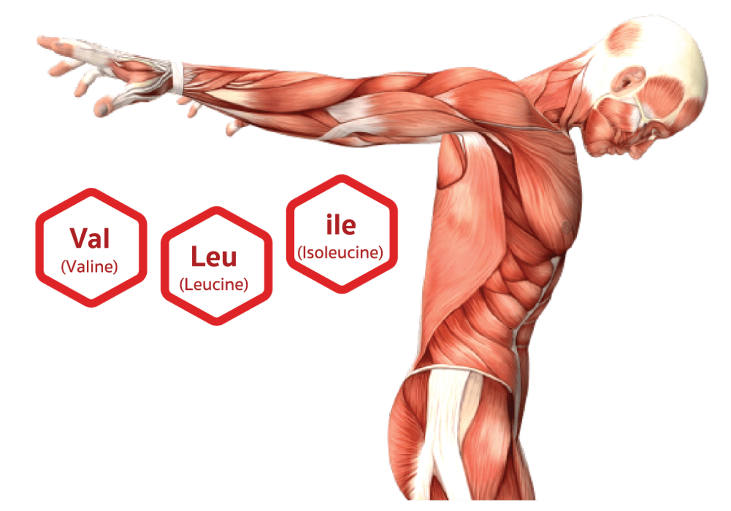 เนื่องจากในบรรดาอวัยวะทั้งหลาย อวัยวะที่มีน้ำหนักมากที่สุดคือกล้ามเนื้อลาย (Skeletal muscles) โดยมีน้ำหนักมากถึงร้อยละ 40 ของน้ำหนักร่างกาย กล้ามเนื้อกลุ่มนี้แสดงบทบาทมากขึ้นในกรณีการดูแลสุขภาพโดยเฉพาะอย่างยิ่งด้านการใช้พลังงาน Kamei Y และคณะ ทำวิจัยรายงานไว้ในวารสาร Nutrients ค.ศ.2020 โดยพบว่าระหว่างการออกกำลังกาย สาร PGC1α เพิ่มขึ้นในกล้ามเนื้อลาย ซึ่งเกี่ยวข้องกับการทำงานของกรดอะมิโนจำเป็นกลุ่ม BCAA โดยเฉพาะอย่างยิ่งลูซีนและวาลีน การเสริมกรดอะมิโนจำเป็นในนักกีฬาและผู้ออกกำลังกายจึงช่วยส่งเสริมการสังเคราะห์โปรตีนในกล้ามเนื้อ ซึ่งหมายถึงเพิ่มการสร้างกล้ามเนื้อ ชดเชยการสูญสลายโปรตีนในกล้ามเนื้อได้ (3) นอกจากนี้งานการศึกษาในอดีตยังยืนยันการสูญสลายของกล้ามเนื้อในหมู่ผู้ออกกำลังกายและนักกีฬา ดังเช่น งานวิจัยของ Shimomura Y และคณะ ตีพิมพ์ในวารสาร J Nutr ค.ศ.2004 พบว่าผู้ออกกำลังกายและนักกีฬาเกิดปฏิกิริยาการสลายของ BCAA ผ่านกลไกการทำงานของเอนไซม์ branched-chain alpha-keto acid dehydrogenase (BCKDH) complex เป็นผลให้ประสิทธิภาพการทำงานของกล้ามเนื้อลดลง ด้วยเหตุนี้ ทีมวิจัยจึงแนะนำให้เสริมกรดอะมิโนจำเป็นในผู้ออกกำลังกายและนักกีฬา เพื่อช่วยเสริมสร้างโปรตีนและกล้ามเนื้อ ชดเชยการสูญสลายของกล้ามเนื้อในคนกลุ่มนี้ (4)