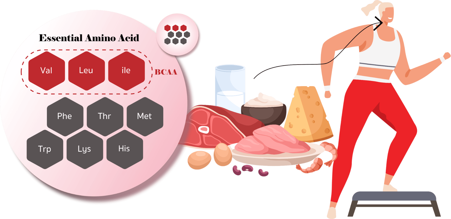 เป็นที่ทราบกันดีว่ากรดอะมิโนจำเป็นมีความสำคัญต่อการสังเคราะห์โปรตีนโดยเฉพาะอย่างยิ่งโปรตีนที่เป็นองค์ประกอบของกล้ามเนื้อ รู้กันทั่วไปว่าการออกกำลังกายทั้งชนิดแอโรบิกและแอนแอโรบิก เกิดการสลับสับเปลี่ยนแหล่งพลังงานระหว่างคาร์โบไฮเดรตและไขมันในกล้ามเนื้อเป็นระยะ เกิดการดึงโปรตีนบางส่วนเพื่อใช้ในการสร้างพลังงานเป็นครั้งคราว