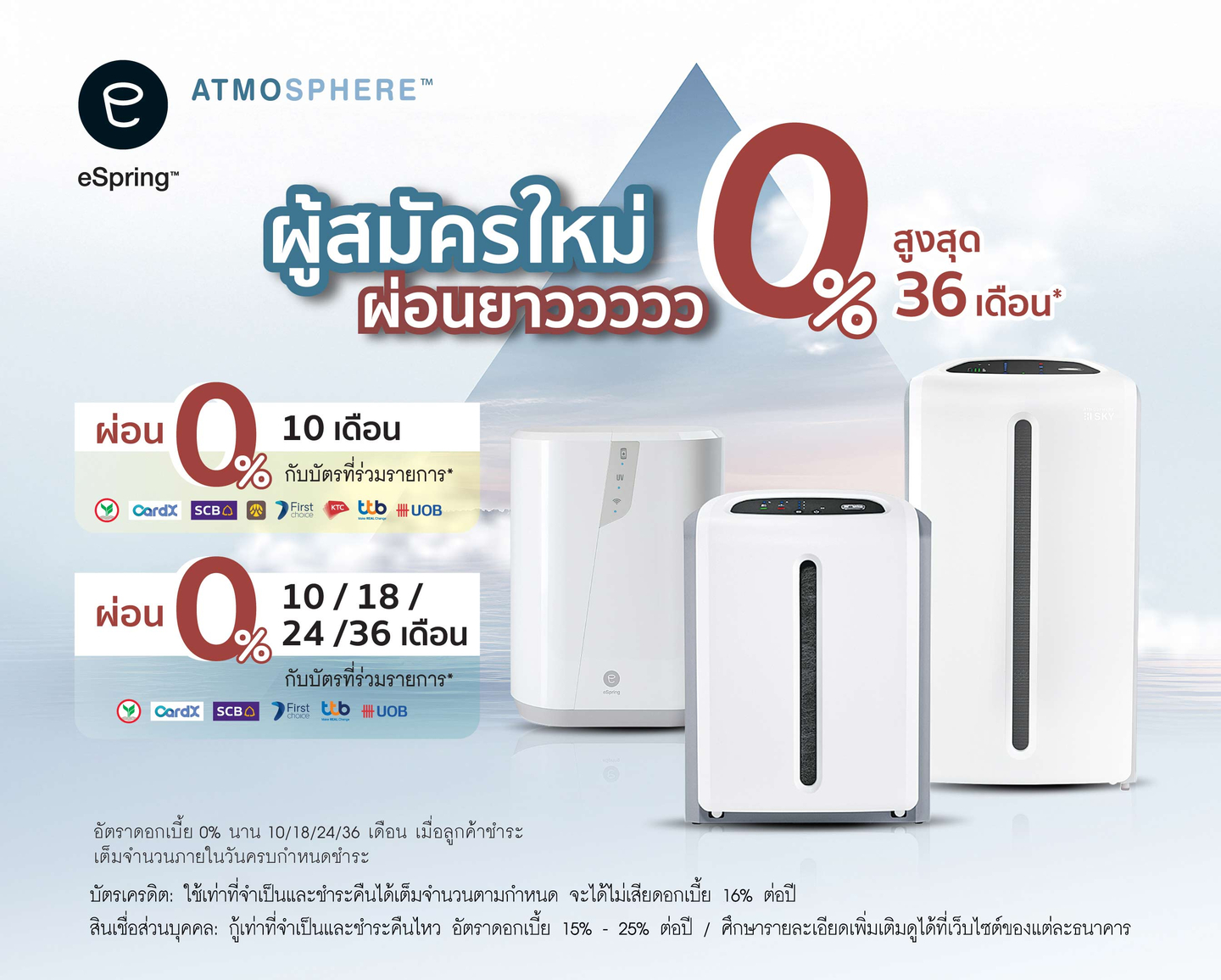 ซื้อเครื่องกรองอากาศแอทโมสเฟียร์ สกาย เครื่องกรองอากาศแอทโมสเฟียร์ มินิ หรือเครื่องกรองน้ำอีสปริง 1 เครื่อง ในราคาปกติ รับสิทธิ์ผ่อน 0% นาน 10 / 18 / 24 / 36 เดือน กับบัตรที่ร่วมรายการ* พร้อมรับเครดิตเงินคืนจากบัตรที่ร่วมรายการ* ระยะเวลาผ่อนขึ้นอยู่กับแต่ละบัตร